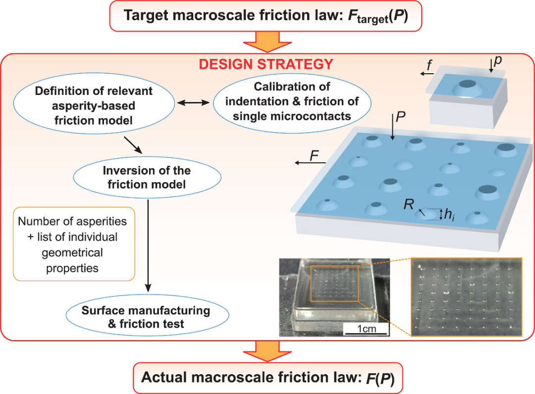 作者表明,半径相同的小凸起构成了简单的构件,可以组合成摩擦元表面。通过在表面上使用许多这样的凸起并调整它们的高度分布,作者可以规定一个理想的、甚至是非线性的摩擦力,该摩擦力抵抗了推动滑动界面的外部负荷。