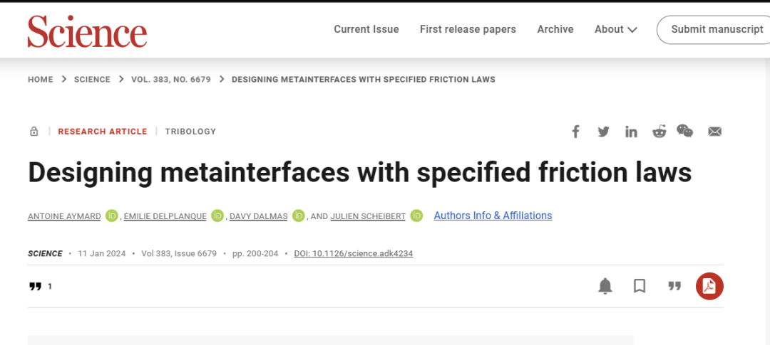 此外,全球有20%的机器能耗被用于克服摩擦阻力。现今,我们对摩擦的控制策略源自于长达一个多世纪的工程经验,通常包括使用润滑油或润滑脂进行界面处理。在最新一期《Science》上,法国里昂中央理工学院Julien Scheibert课题组报告了合理设计界面摩擦特性的替代策略。他们的摩擦控制方法实现了可实时适应环境的表面。相关成果以“Designing meta interfaces with specified friction laws”为题发表在《Science》上。