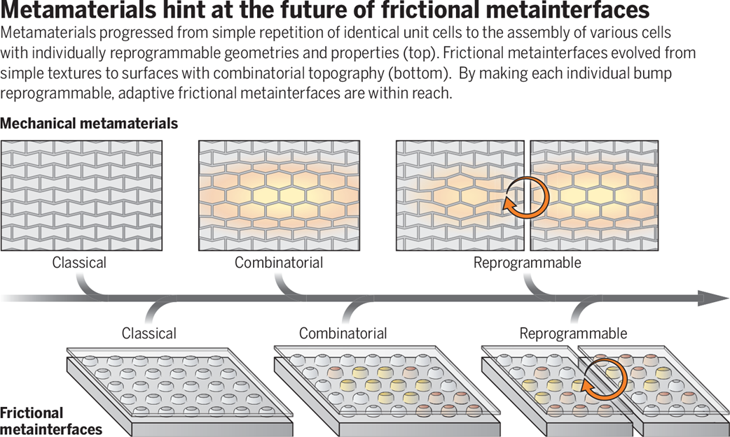 在超材料界面中嵌入此类活性元素,可实现摩擦控制并促进摩擦适应性。事实上,这种可重构界面的简单形式已经实现,可用于控制润湿性。摩擦自适应性将有许多应用,如带有触觉反馈的触摸显示器。目前控制摩擦的尝试主要围绕电化学或电粘合。元界面方法将取代化学方法,因为它不仅能控制简单的摩擦力,还能控制摩擦力与法向载荷的整个非线性关系。主要的工程挑战将围绕可靠性展开,因为摩擦通常伴随着磨损。活性元件的微型化也将是一个挑战,但微型系统或刺激响应材料都可能为此提供解决方案。实现摩擦控制的道路崎岖不平,但前景光明。