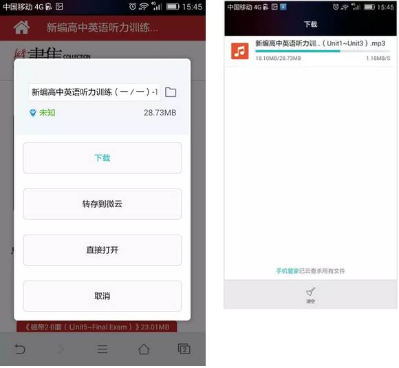 5.点击微信右上角的菜单,选择【在浏览器中打开下载】项,使用手机浏览器进入下载页面后,点击红色按钮,保存音频资料MP3文件到手机。