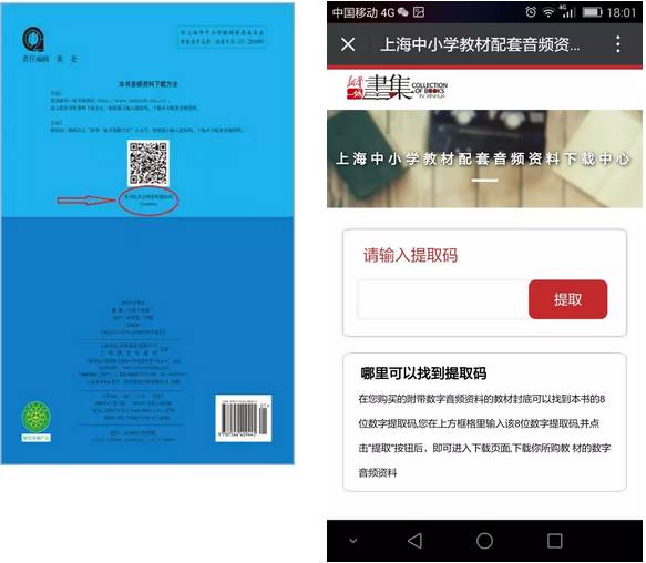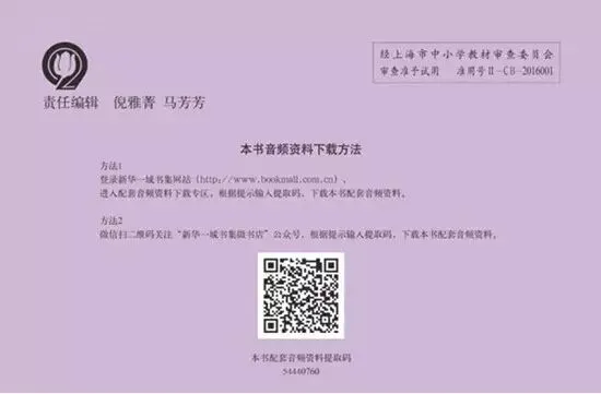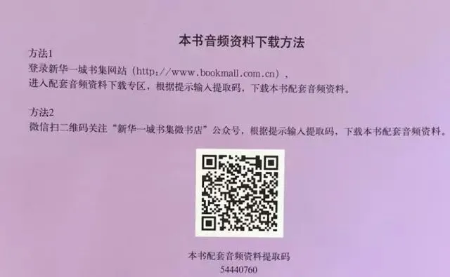 中学生和家长在领到外语教材的同时,将同步领到教材配套音频材料下载说明书,根据说明书中的操作流程指引,使用公共互联网,通过访问教材封底上的网址或者扫描二维码,输入对应的提取码即可下载。