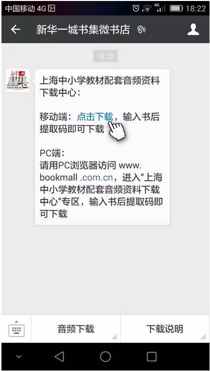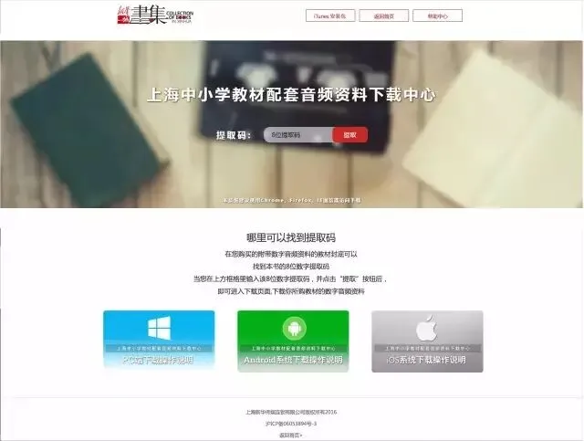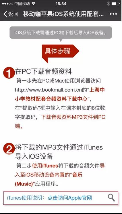 3.根据页面提示,将音频资料MP3文件先下载到PC机,再使用PC机端iTunes软件将下载的音频文件导入至iOS移动设备内置的“音乐”应用程序。页面提示内容:在PC机使用浏览器访问http://www.bookmall.com.cn的“上海中小学教材配套音频资料下载中心”,在“提取码”框中输入在课本封底的8位数字提取码,下载音频资料MP3文件到PC端,使用iTunes将下载的音频文件导入至OS移动设备内置的“音乐”应用程序。