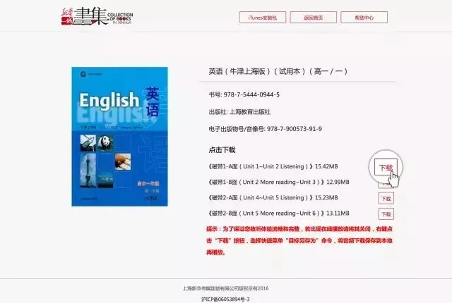 2.点击【点击下载】链接,进入“上海中小学教材配套音频资料下载中心”;