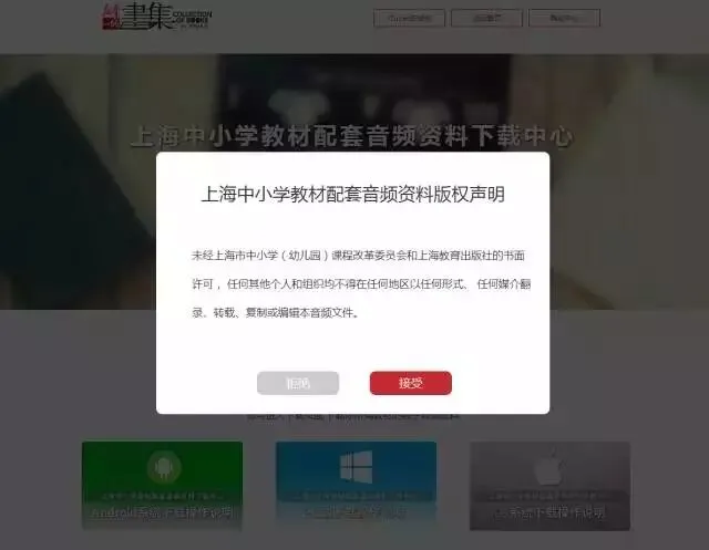 4.点击【提取】按钮后,可看到“上海中小学教材配套音频资料版权声明”页, 阅读版权声明,点击【接受】按钮后可看到进入下载页面的操作提示
