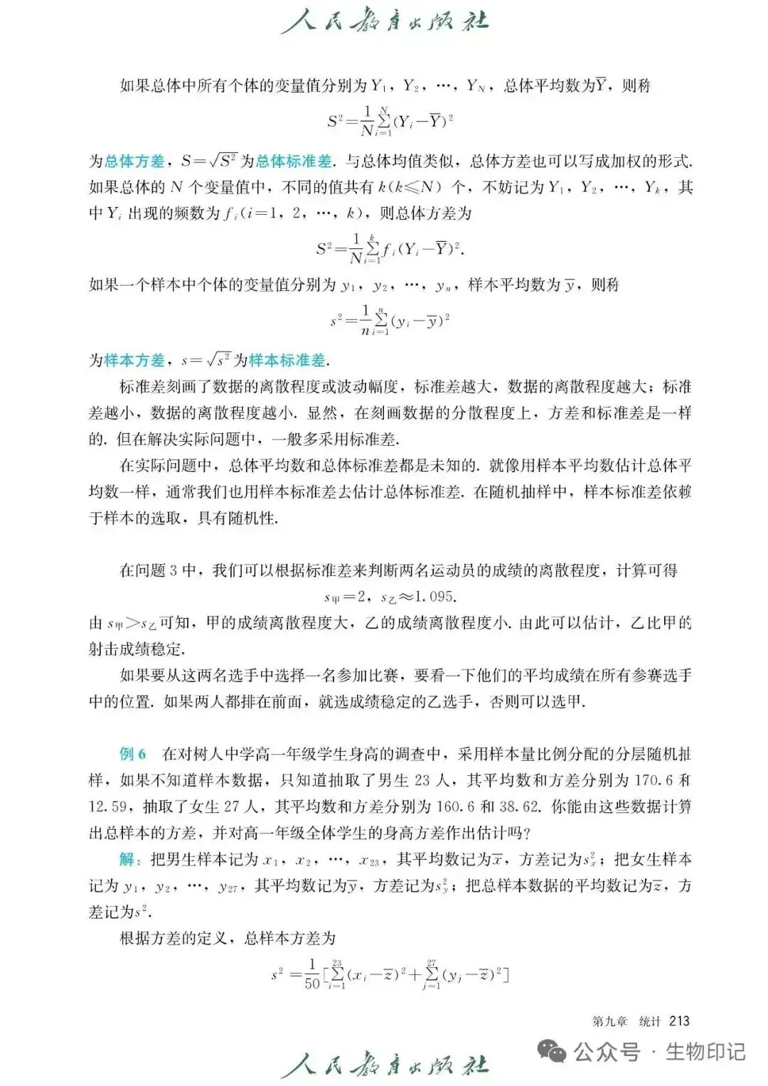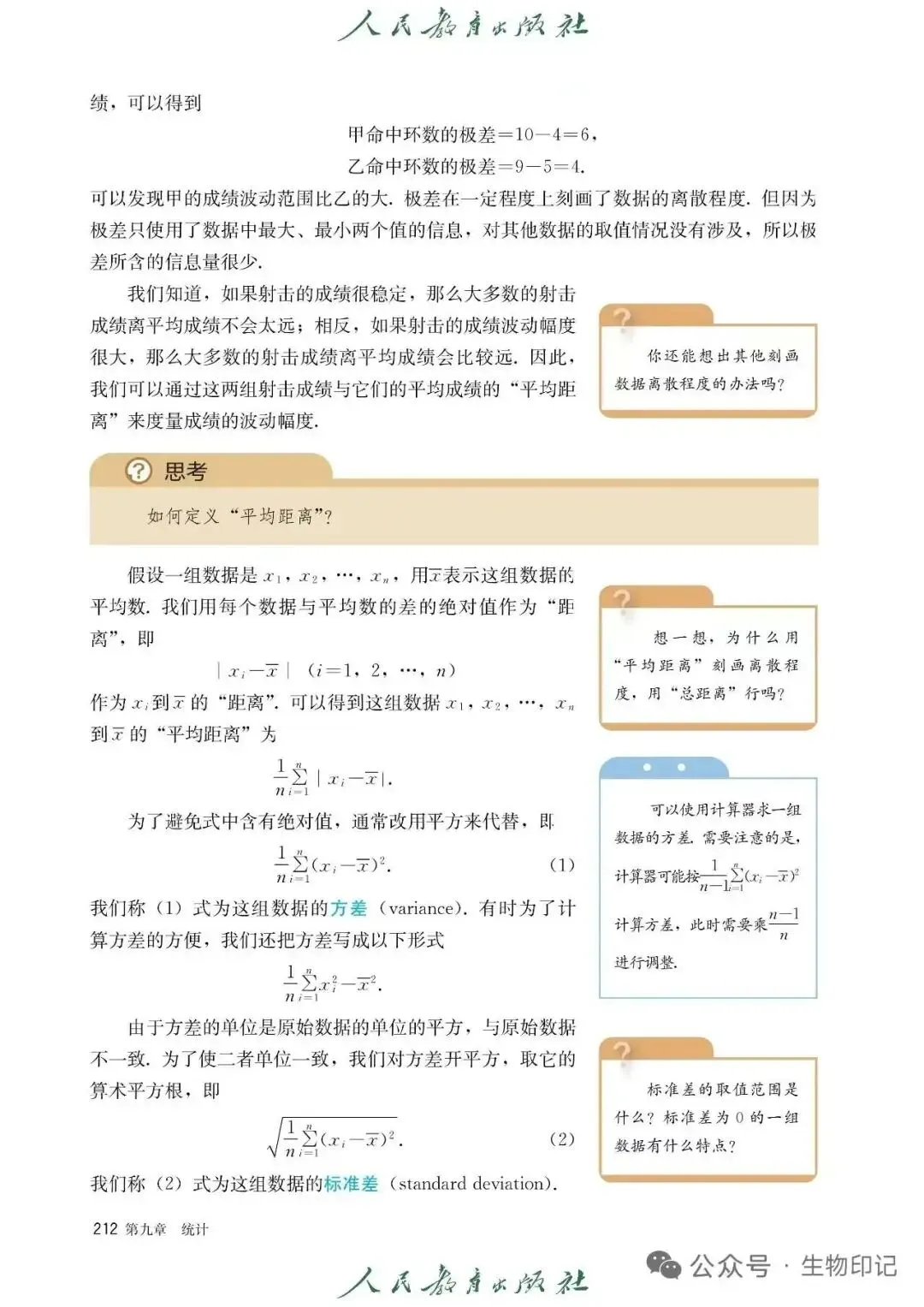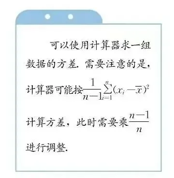 这是来自人教版课本中对方差及标准差的定义,实际上,是严谨的,也清晰阐述了样本和总体这两种方式,同时,不知道大家是否注意到,第二张图片右侧的小蓝框里给出的——