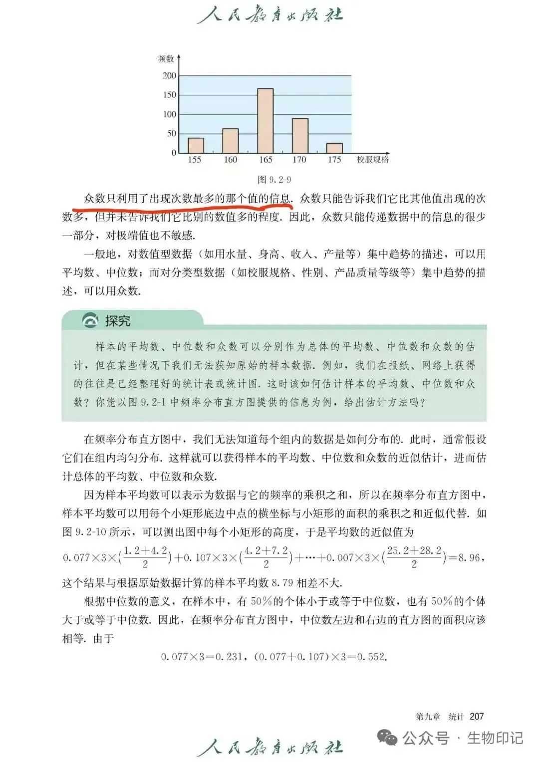 在人教版的课本中,不知道是我漏掉了还是什么,只在这里发现了对于众数的说明。或许是因为初中课本上已经给出过众数的具体说明,于是高中课本就省略了,于是显然,在这里,高中的大部分同学会想当然的认为——频数直方图中最高矩形的中点就是众数。下面给出搜集资料后的进一步严谨地说明: