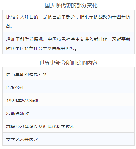 2017年版历史课程标准与2003年版的历史课程标准相比,课程内容上有所增删。必修课程由原来的专题史变成了通史,按时间排序分为中国史和世界史。