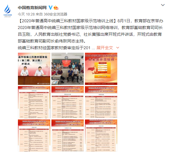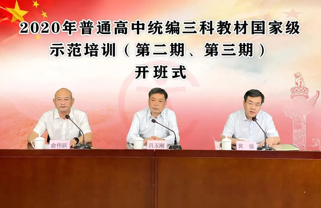 8月1日,教育部在京举办2020年普通高中统编三科教材国家级示范培训网络培训,教育部基础教育司司长吕玉刚,人民教育出版社党委书记、社长黄强出席开班式并讲话,开班式由教育部基础教育司副司长俞伟跃同志主持。统编三科教材经国家教材委审定后于2019年率先在北京、天津、辽宁、上海、山东、海南六省市投入使用,根据教育部关于普通高中新教材使用的部署安排,今年将新增15个省使用新教材,全国使用新教材的省份累计达到21个。2022年之前,统编三科教材将在全国投入使用。为克服疫情影响,确保各地暑期能完成新教材全员培训工作,受教育部委托,人民教育出版社开发网络培训平台,采取网络视频全员培训方式,面向21个省份同步举办统编三科教材必修和选择性必修两期培训。这次培训的主要内容包括党中央国务院关于统编三科教材建设的有关要求,统编三科教材的重大意义和精神实质,编写思路和基本体例,必修和选择性必修的主要内容、重点难点、教学指导与实施建议等。