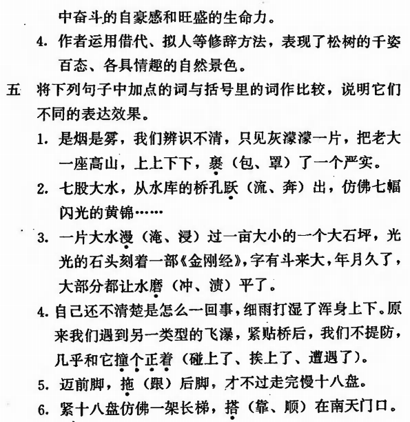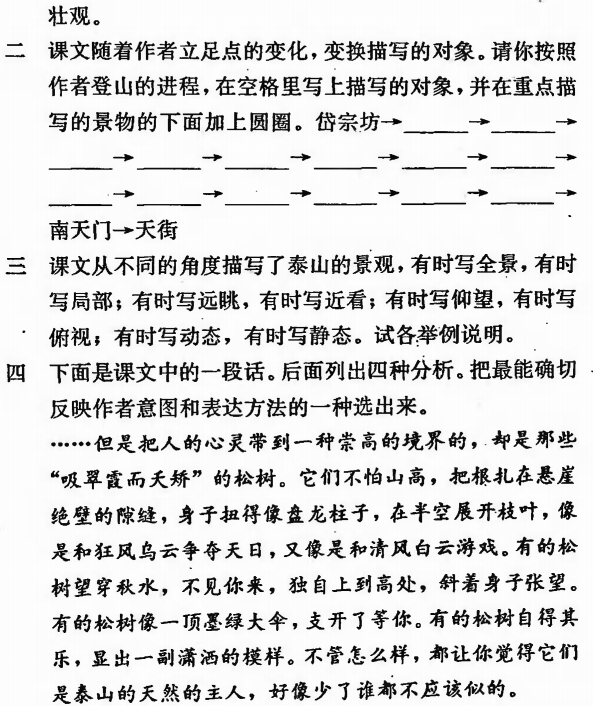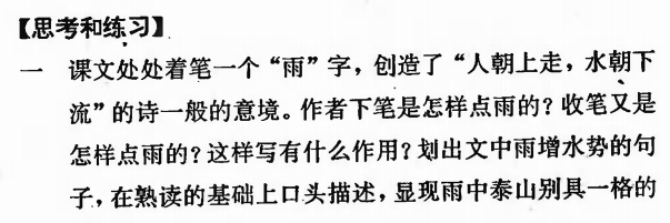 过去的教材,每篇课文后面都会附有练习题,这些练习题基本涵盖这篇课文的写作特点,可以作为“导学案”来使用。这都是名师设计的题目,可以当作阅读课文的抓手。不要觉得这样设计呆板,它比大单元实用多了。如果连一篇课文都读不透,哪里谈得上“大单元阅读”?下面就是1990年代教材中的《雨中登泰山》的课后思考与练习。
