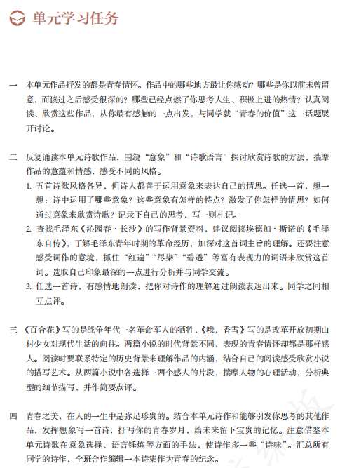 现在的教材呢?只有“光杆子课文”,没有课前提示,也没有课后练习,有的只是“单元学习任务”,每个单元五六篇课文,从整体上设计四五道题目。下面就是现行高中教材第一册第一单元的学习任务,第1题要求展开关于“青春的价值”讨论,第2题要求感受五首诗歌的不同风格,第3题要求比较两篇小说,第4题建议全班编辑一本诗集。看上去确实高大上,但实际教学中很难操作,“高大上”到让丈二的和尚都摸不着头脑了。