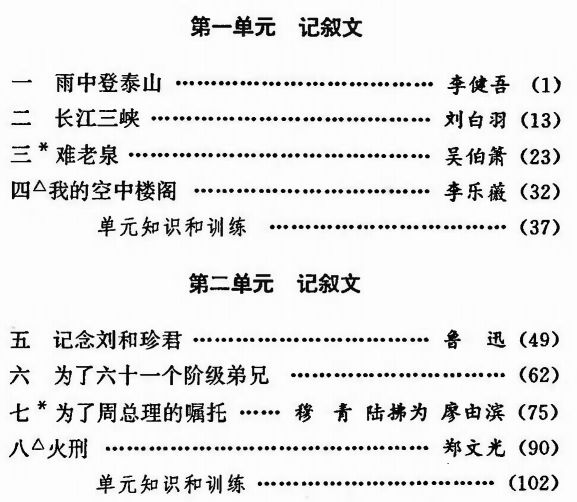 正像上段所说,过去的教材,对每一册的学习重点是有个整体设计的,比如1990年版的高中语文教材第一册就以记叙文为主,第一单元是写景抒情类记叙文,第二单元是写人叙事类记叙文,第五单元则是抒情言志类散文,内容多而不乱,适合高一学生。