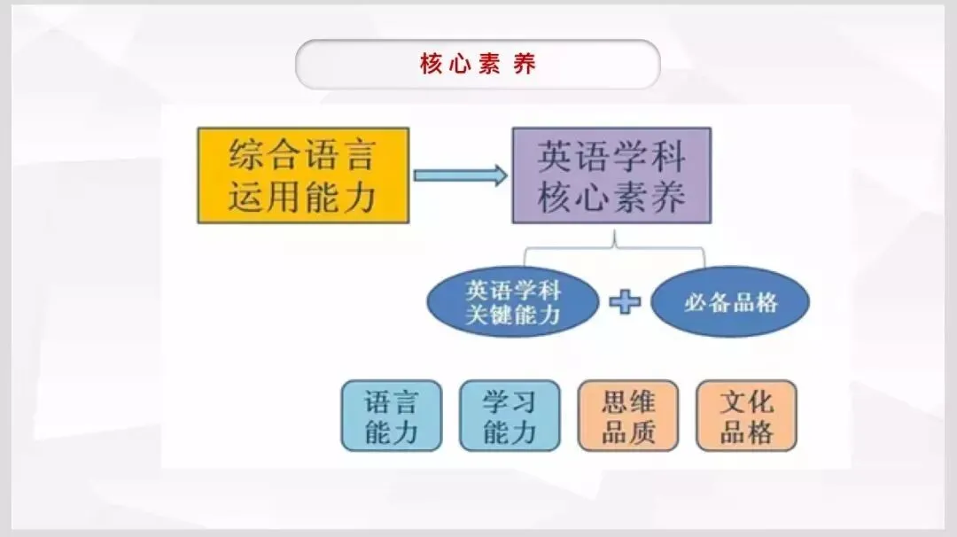 它由四个要素构成,语言能力、文化意识、思维品质和学习能力。这四个要素都是非常非常重要的,是落实立德树人和学科育人的四个重要方面。
