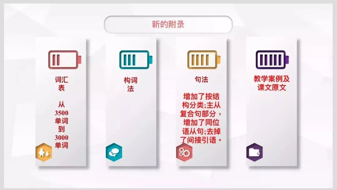 3、《语法项目表》:新《课标》在句子成分部分,增加了按结构分类;主从复合句部分,增加了同位语从句;去掉了间接引语。