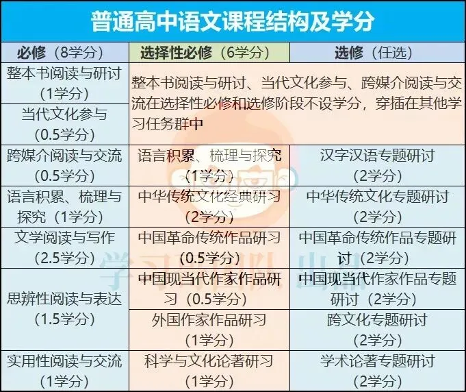 普通高中语文课程结构及学分