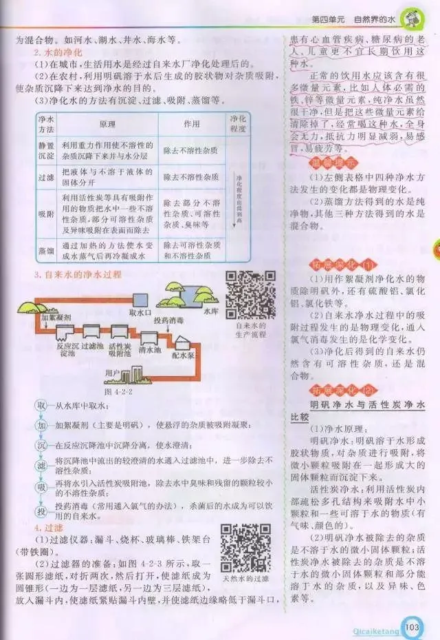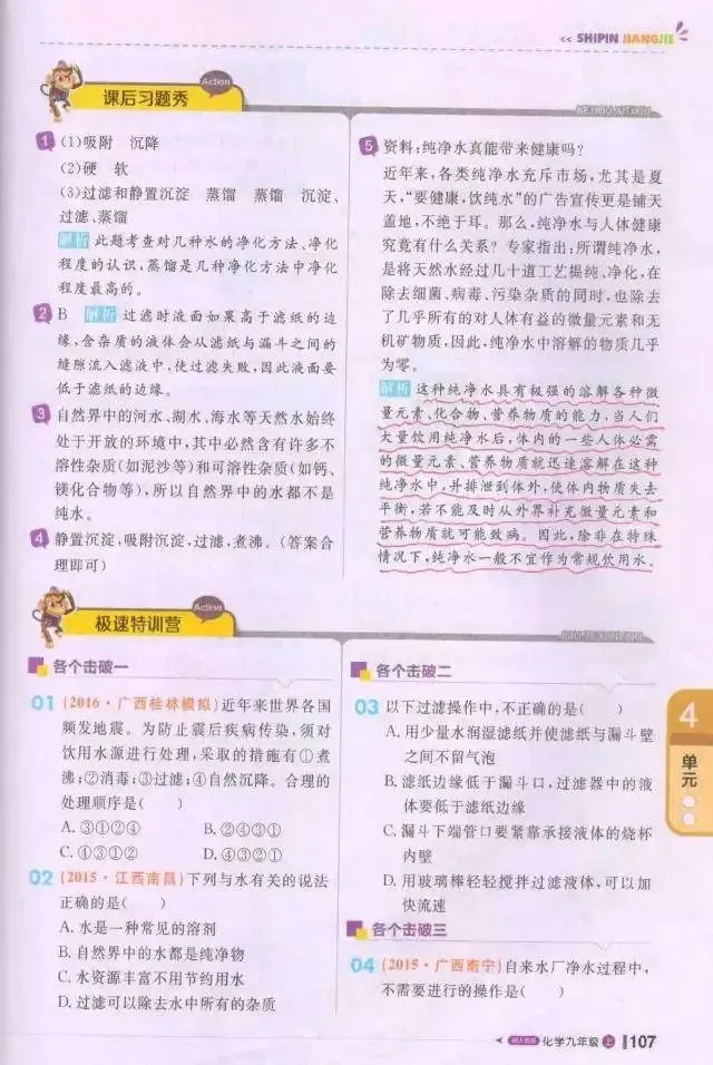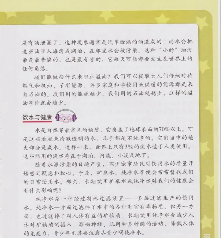 教科版四年级《科学》上册第41页提到:纯净水是一种经过特殊过滤装置——多层过滤生产的饮用水。纯净水一方面过滤掉了水中的各种有害有毒物质,但另一方面,也过滤掉了对人体有益的矿物质。长期饮用纯净水会减少人体对矿物质的摄入,影响神经、肌肉和多种酶的活动,降低人体的免疫力,青少年尤其要注意尽量少喝纯净水。《1+1轻巧夺冠》第107页中说到:专家指出,所谓纯净水,是将天然水经过几十道工艺提纯、净化,在除去细菌病毒、污染杂质的同时,也除去了几乎所有的对人体有益的微量元素和无机矿物质,因此,纯净水中溶解的物质几乎为零。这种纯净水具有极强的溶解各种微量元素、化合物、营养物质的能力,当人们大量饮用纯净水后,体内的一些人体必需的微量元素、营养物质就迅速溶解在这种纯净水中,并排泄到体外,若不能及时从外界补充微量元素和营养物质就可能致病,因此,除非在特殊情况下,纯净水一般不宜作为常规饮用水。《七彩课堂·初中一点通》第103页:患有心血管疾病、糖尿病的老人、儿童更不宜长期饮用纯净水。正常的饮用水应该含有很多微量元素,比如人体必需的铁、锌等微量元素,纯净水虽然很干净,但是把这些微量元素给清除掉了,经常喝这种水,全身会无力,抵抗力明显减弱,易感冒、易疲劳等。纯净水是非常“干净”,水中没有任何物质,所以称之为“死水”“穷水”,养鱼不用纯净水,浇花不用纯净水,那么人为什么要喝这种水?难道就是因为那一点安全而忽略了纯净水给身体造成更大的危害?