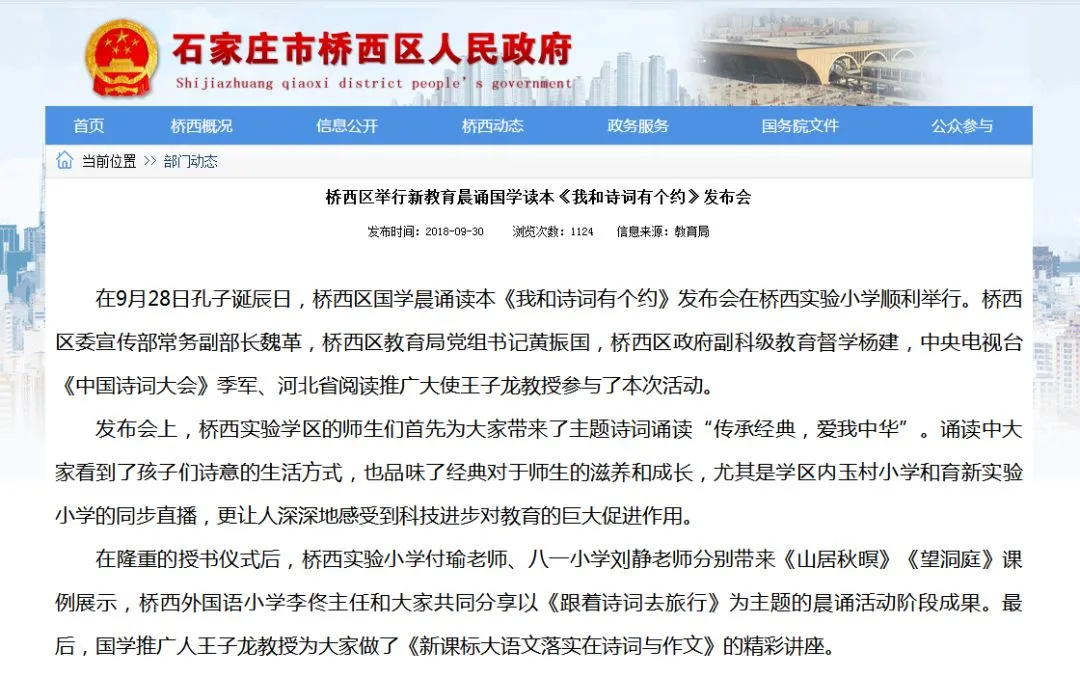 而在今年9月28日孔子诞辰日,该区在桥西实验小学举办了《我和诗词有个约》国学晨诵读本发布会,多名领导及河北省阅读推广大使王子龙教授参与。此后,根据桥西区域内多所小学官方微信消息,《我和诗词有个约》进入学生晨读课堂。