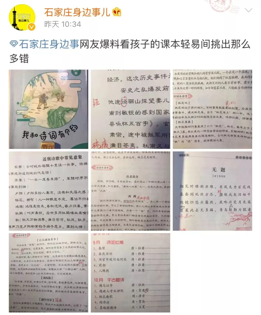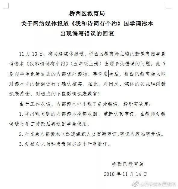 针对“新教育国学晨诵读本《我和诗词有个约》错漏百出”一事,石家庄市桥西区委宣传部官方微博发布落款为“区教育局”的回复,称“将出现问题的内部读本全部收回,重新认真审订,由教师对错误进行手工修改后再返回学生使用”。