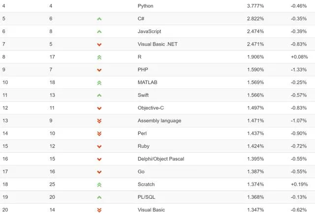 从2016年到2017年,第4位的Python地位稳固,VB则从第14位掉到了第20位。图片来源:tiobe.com