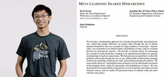 另一名Python开发者、现年17岁的学生凯文·法兰斯(Kevin Frans)做出了更为惊人的成就:他以第一作者的身份发表论文《Meta Learning Shared Hierarchies》,提交到了机器学习顶级会议ICLR2018上。