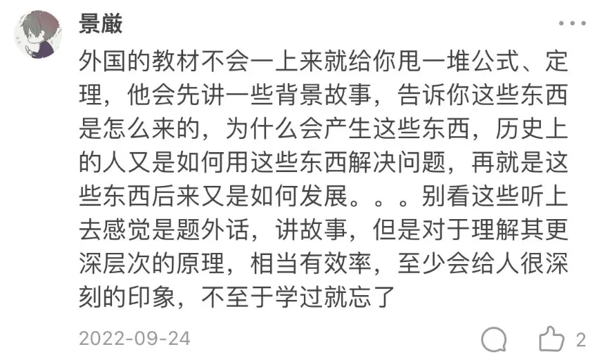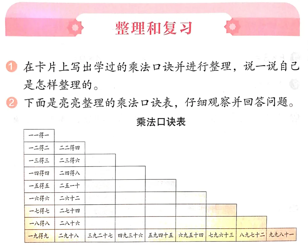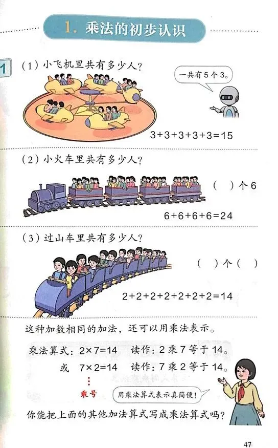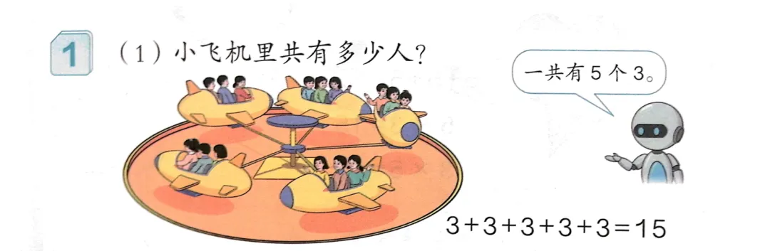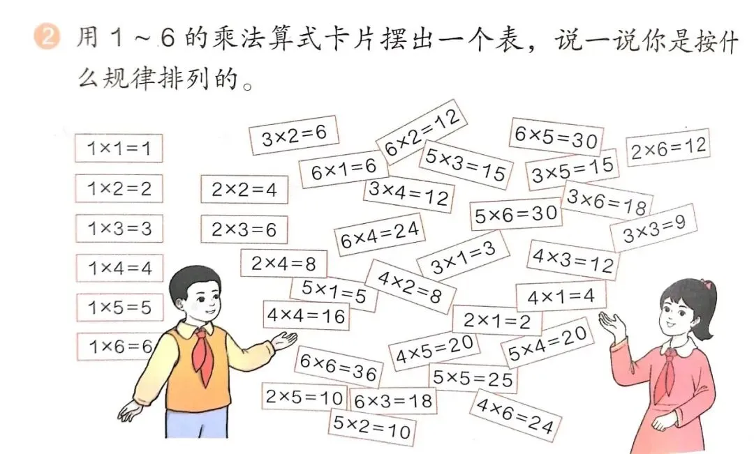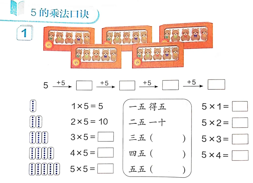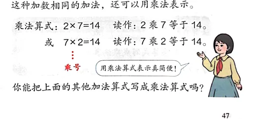 这样的理念,体现在教材上,就是鼓励有兴趣的孩子学透数学,帮助天资一般的孩子去一步步理解数学。结果是,美国小学数学教材就变成了一本本大部头。打开数学课本,整体上就是这样的感受 ...相比之下,中国数学课本体量小得多。大量的功夫都要花在课外的辅导班、教辅上。那么中美教材在编写上到底有啥区别呢?还是拿具体例子来看。比如,每个小朋友都要学的乘法。其实,让孩子理解“乘”的概念,其实完全不是我们大人想象的那么简单。“乘法口诀表”,一言难尽 ...先来说说我们的独有发明——乘法口诀表。(熟记乘法口诀,是咱们二年级数学教材里的一大主题。)这个绝对是一个充满智慧的创造,相信绝大部分小朋友学习乘法,都是从这张口诀表开始的。这张神奇的口诀表,大大提升了我们中国小朋友计算乘法的速度。 很多小朋友在不知道乘法是什么的时候,嘴里已经会背好多的乘法口诀了。乘法口诀还和口语、故事连在了一起,也许又是“数学语文化“的一个体现。比如”不管三七二十一“,比如孙悟空去西天取经要历经”九九八十一难“。但是乘法口诀真的这么好背吗?这个视频,一定要看看 ...某种程度上,它体现了中国孩子在数学启蒙阶段的共同“困境”。可怜可爱又让人心疼,大家肯定在想,为啥这么简单的一句“3×5=15”,小姑娘就是背不下来呢?其实,对这个小朋友来说,这根本不是一个乘法计算题,也不是一个数学问题,而是一个记忆与背诵问题。此时她完全不理解“乘”,因此在她脑海里乘法口诀表里的数字就是一串没有规律的乱码,和下面这张图没有区别。数学靠“背”,有用吗?我相信大家一定有自己的答案。数学不是算数,计算也不可能只靠记忆。背乘法口诀,可以让计算乘法的速度变快。中国小朋友的乘法计算速度一定是最快的,但是这里有一个大问题 -- 对乘法的意义不见得真正理解。下图是一个孩子的错题,显然没搞清楚“乘、除”概念。看来他并没有理解“乘”,而不理解“乘”,就不会理解“除”;就像不理解“加”,就不会理解“减”一样。数学真是一门环环相扣、漏一步错百步的学科。相比之下,美国的小朋友不可能背出“one one equal one”这样的口诀,所以他们只能慢悠悠地去了解乘法。中国二年级上学期就开始表内乘法了,美国三年级才开始。先来看看中国人教版的数学书(二年级上册)是怎么去引入乘法的吧!