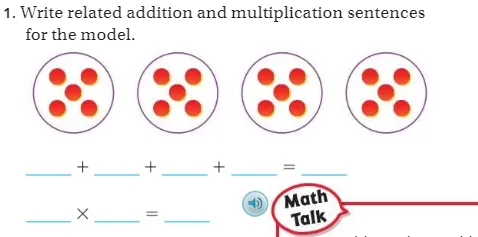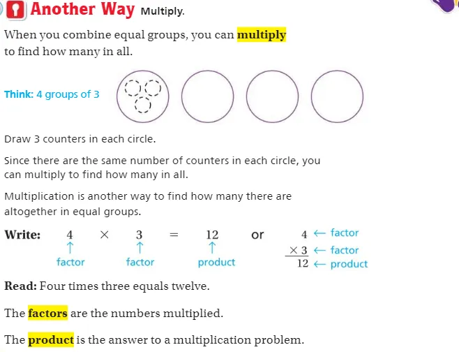 再来看,美国孩子是怎么学“乘”的?乘这个字对于全世界的小朋友来说,其实都是不容易理解的。美国小学数学教材的讲解方法要循序渐进的多。首先,用“组 groups of” 的概念,说明“乘”“4乘2”,严格上来说是4x2这个算式的读法。4组“2”,意思是,“2个”为一组,一共4组,表达的是乘法的含义。别看在语言用词上只是小小的一个改变,但它却可以立刻让孩子感受到乘法的内涵。就是这么神奇!中国的“4个2”也有“4组2”的意思,但远远不够具象,没有大量借助模型加深孩子理解。相比之下,当数字变大、计算变复杂时,美国教材的这种简捷模型,表现力就比较强。孩子看到4*3,眼前出现这样“4组3”的场景 ...这比数插图中的小人要灵活、清晰的多。