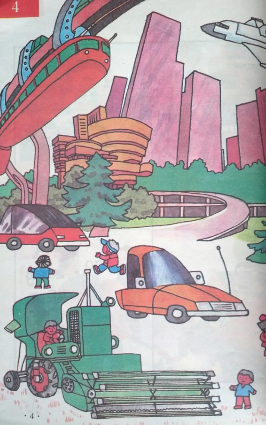 以至于在这套90年代初的教材中,你能看到巨大飞船和悬挂式地铁在城市上空穿梭,造型前卫的汽车在公路奔驰,极具科幻感的社会主义赛博城市。