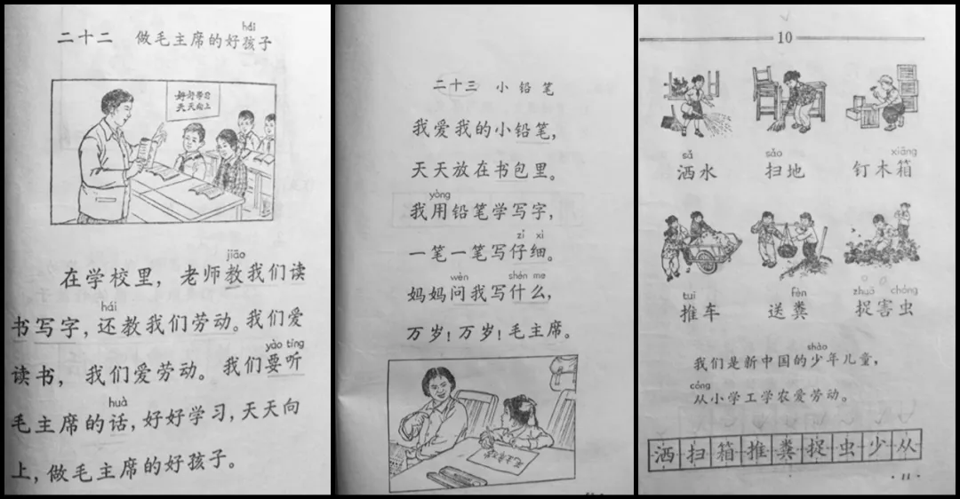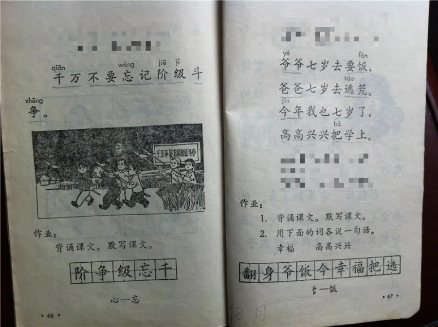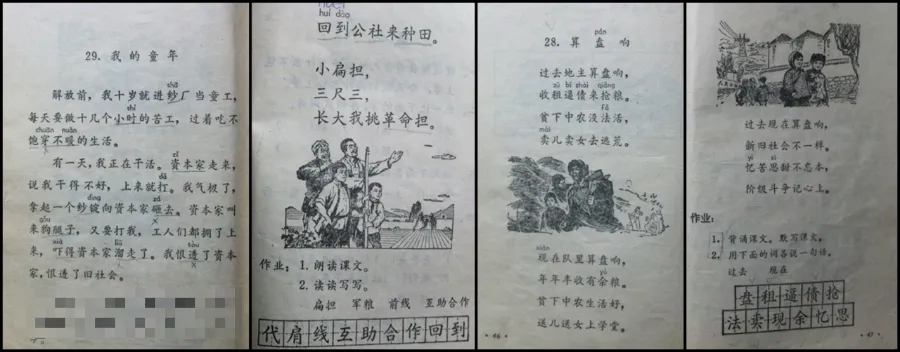 比如这套70年代的北京市小学语文课本,如今读来可谓惊心动魄。