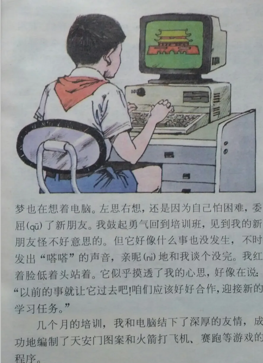 小学五年级课本,还对电脑进行了科普。主人公用的还是一台DOS操作系统的电脑。而从文字描述上看,这不像是学电脑,倒像是一场人和人工智能的恋爱,充满对现代科技生活的憧憬。