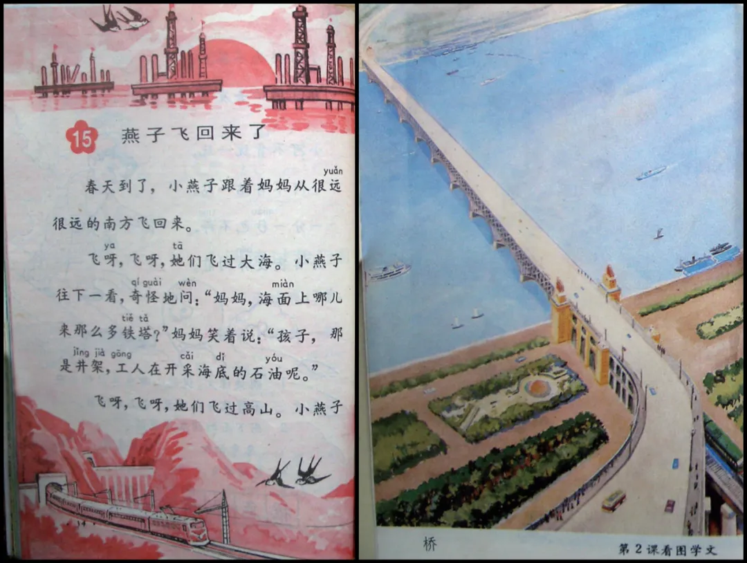 而对于社会主义现代化事业的想象,从80年代就开始成为教材插画的一大主题。林立的高压电塔,奔驰的列车,壮阔的大桥,先进的海上油田,都是波澜壮阔历史进程在小学课本中的缩影。