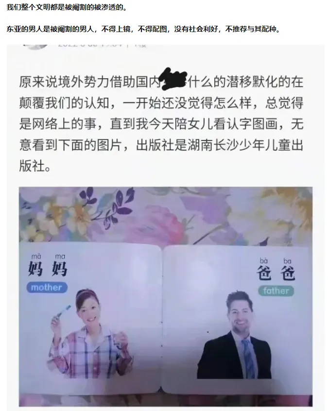 看上面这个图,妈妈是中国女人,而爸爸呢?很明显匹配的是白种男人。这对孩子们的心灵影响,会有多大?!