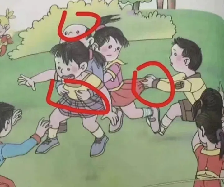 课本插画里的小男孩保持小女孩的胸、以及揪住小女孩的裙子,能认为对生活中孩子们的行为一点没影响吗?