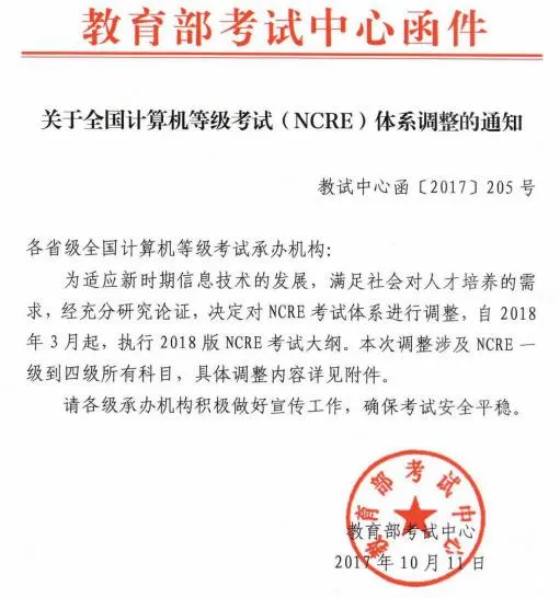 除了中小学的变动之外,教育部考试中心于 2017 年 10 月 11 日发布全国计算机等级考试(NCRE)体系调整的通知。