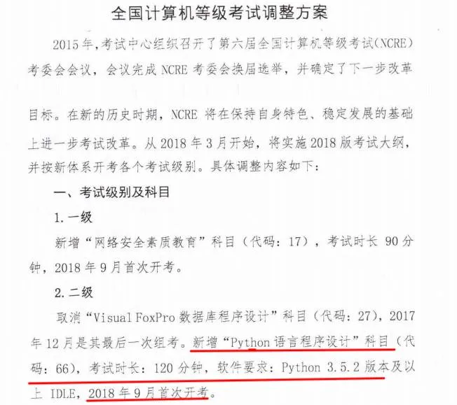 新增“Python 语言程序设计”科目(代码:66),考试时长:120 分钟,软件要求:Python 3.5.2 版本及以上 IDLE,2018 年 9 月首次开考。