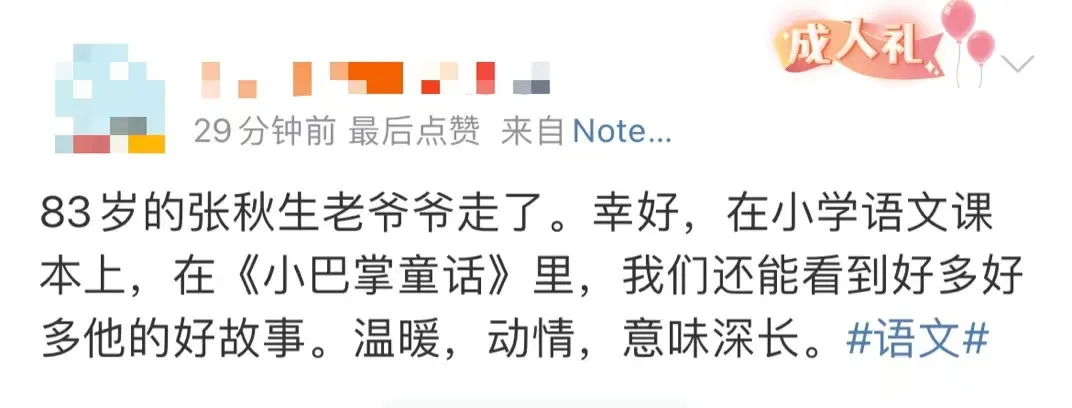 消息传来,文学圈出版界悼念缅怀声一片。儿童阅读推广人、评论家王林感叹:“张秋生老师一路走好!您是入选小学语文教材课文最多的作家之一,感谢您给孩子带来的爱、美、思考……”作家简平说:“他充满童趣、智慧、温暖的小巴掌童话影响了无数大小读者。”