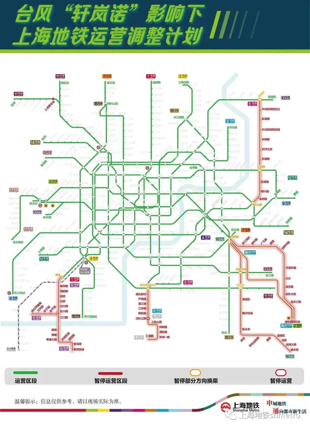 【警惕!台风“轩岚诺”来袭】据“上海发布”,上海地铁全面进入临战状态,根据台风实际影响,可能分阶段采取限速或停运等措施。2号线东延伸段、5号线、6号线、8号线、16号线、浦江线、磁浮线等全线或部分区段可能限速或停运。