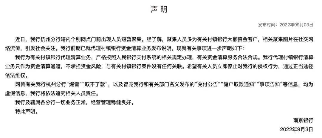 【南京银行:网传杭州分行“爆雷”“取不了款”等均为虚假信息】据南京银行9月4日公告:我行为有关村镇银行代理清算业务,只作为资金清算通道,有关资金清算服务合法合规,不承担资金风险,与有关村镇银行案件没有任何关联。网传有关我行杭州分行“爆雷”“取不了款”,以及冒充我行和有关部门名义发布的“兑付公告”“储户取款通知”“事项告知”等信息,均为虚假信息。
