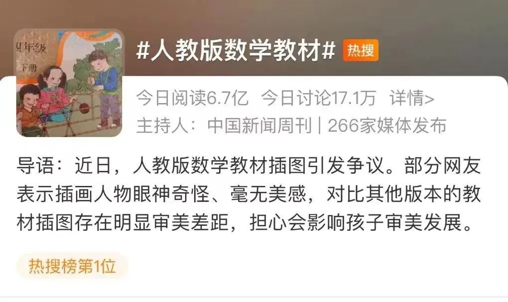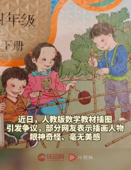 有网友反映人教版数学教材插画人物眼神奇怪、毫无美感,对比其他版本的教材插图存在明显审美差距。
