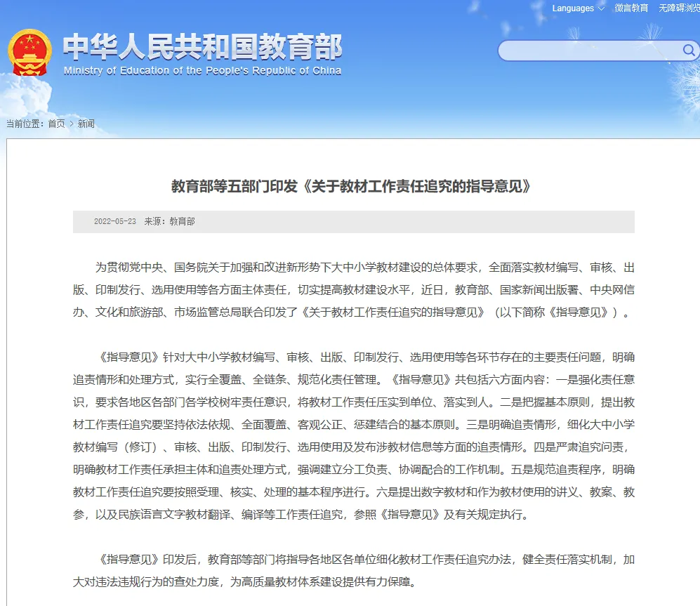 5月23日,教育部、国家新闻出版署、中央网信办、文化和旅游部、市场监管总局联合印发了《关于教材工作责任追究的指导意见》。