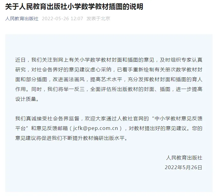 近日,我们关注到网上有关小学数学教材封面和插图的意见,及时组织专家认真研究,对社会各界好的意见建议虚心采纳,已着手重新绘制有关册次数学教材封面和部分插图,改进画法画风,提高艺术水平,充分发挥教材封面和插图的育人作用。