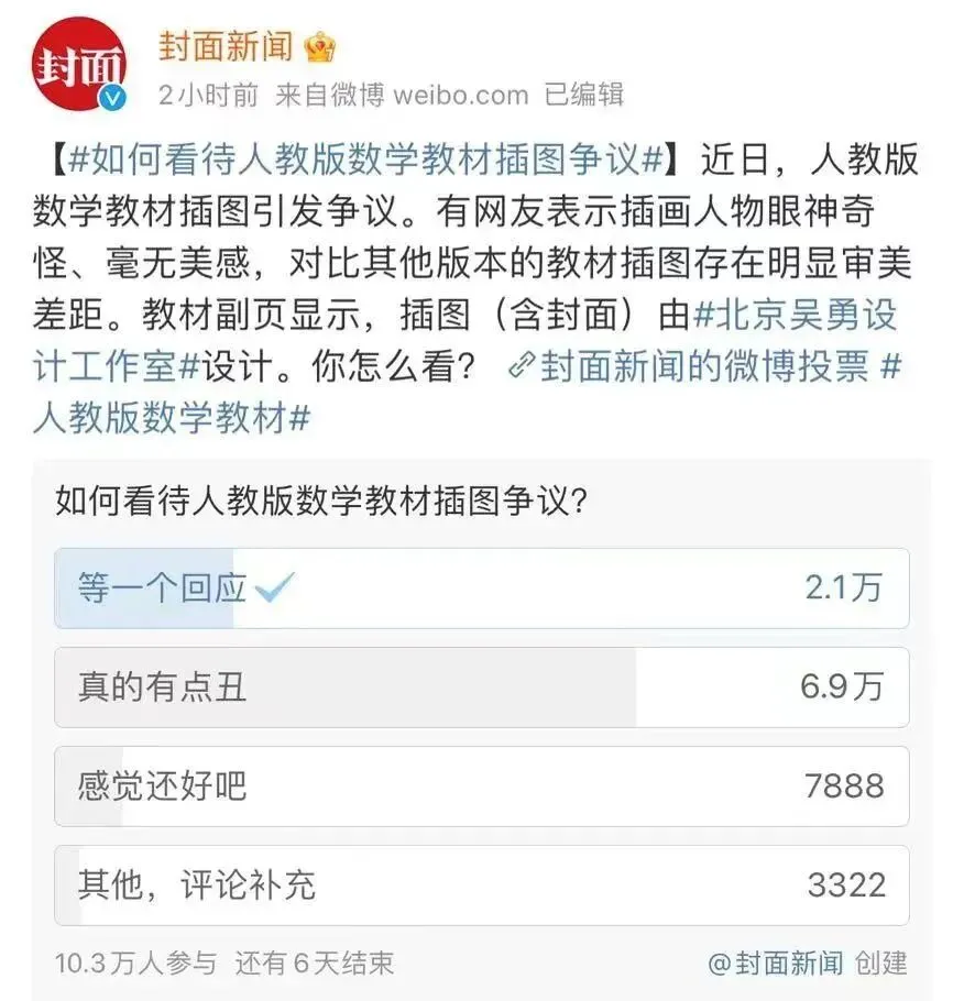 一则10万多名网友参与的投票显示,大部分网友认为该教材插图“真的有点丑”。