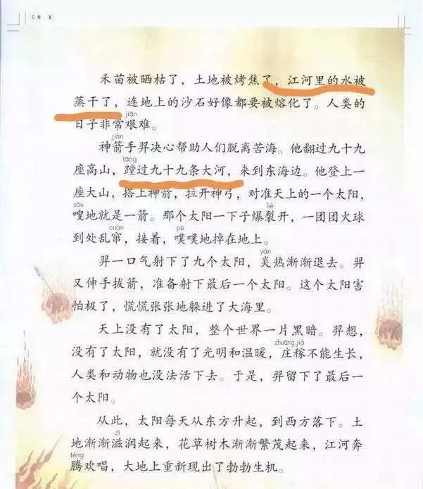 据@时间视频报道,近日,福州8岁的二年级男孩小冯发现,语文课文《羿射九日》中前一段刚提到“江河里的水被蒸干了”,下一段又提到“他蹚过九十九条大河,来到东海边”。因此他质疑道:“既然晒干了,那后羿是怎么蹚的?是不是课文出错了?”
