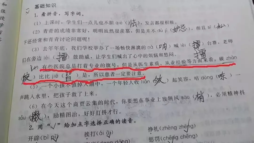 近日,一位医生在整理上小学的儿子的书包时,竟然发现在小学课本上出现这样一道看拼音填空题:“有些医院总是打着专业的旗号,但是从医生的素质、从业经验等方面来看,破zhàn( )比比jiē( )是,所以患者一定要注意。”