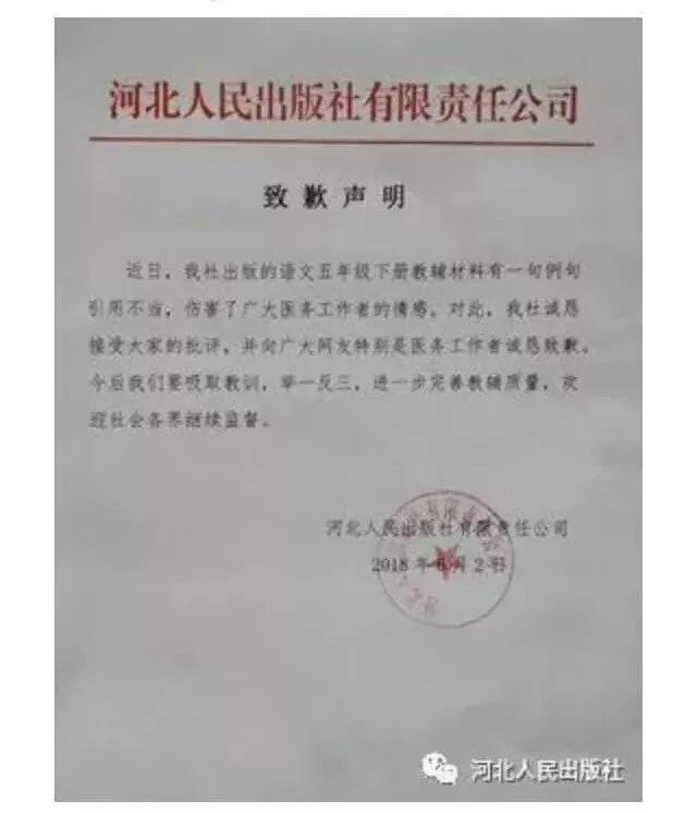 在多方的共同促使下,河北人民出版社认识到了错误和事情的严重性。6日2日,在其官方微信上发表了致歉申明,诚恳接受大家的批评,对这起伤害了广大医务工作者情感的事件,表示歉意。