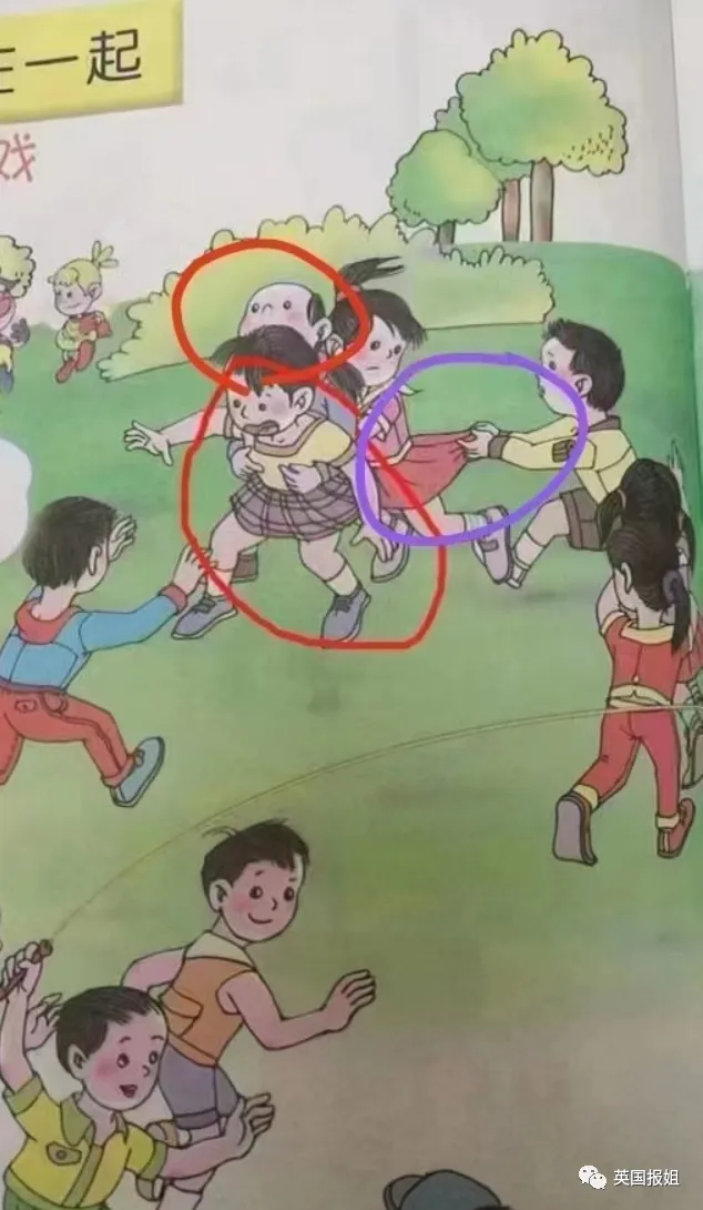 真正让网友无法接受的,是这套面对小学儿童的教材中,出现了很多令人不适的画面。