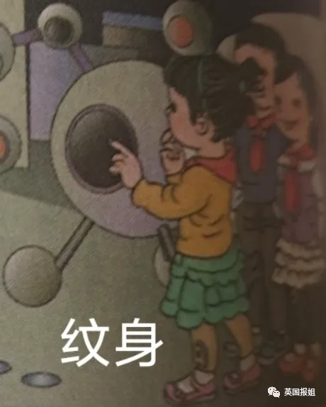 有插图中,还戴着红领巾的孩子,小腿上却有一大片纹身。