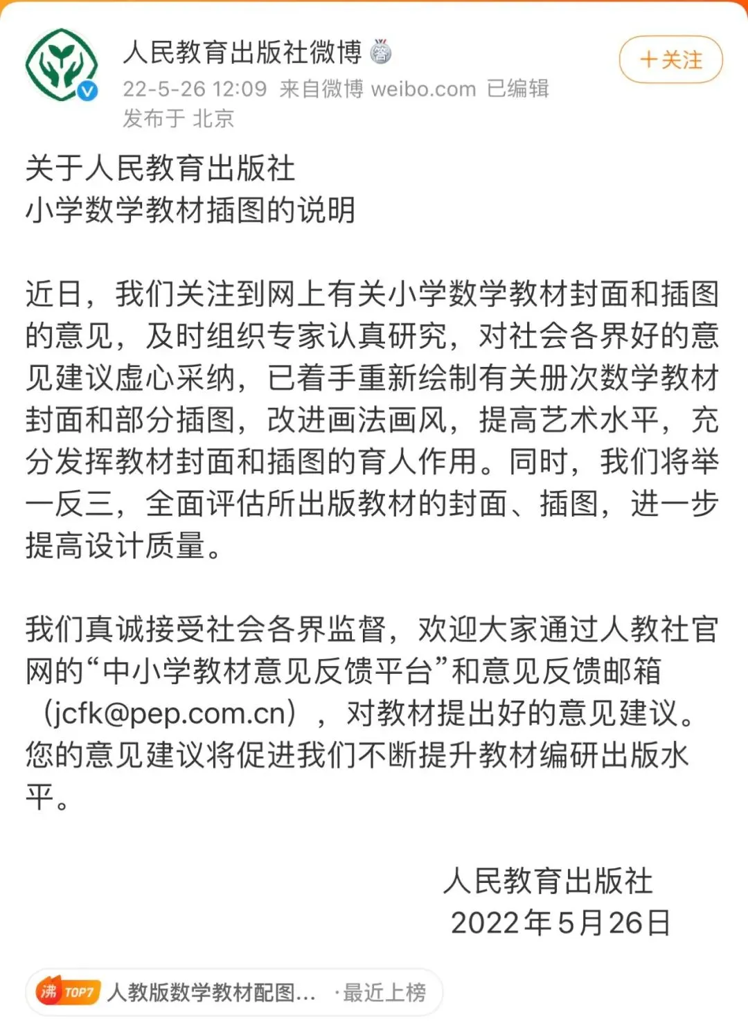 人民教育出版社5月26日发布《关于人民教育出版社小学数学教材插图的说明》称,近日,我们关注到网上有关小学数学教材封面和插图的意见,及时组织专家认真研究,对社会各界好的意见建议虚心采纳,已着手重新绘制有关册次数学教材封面和部分插图,改进画法画风,提高艺术水平,充分发挥教材封面和插图的育人作用。同时,我们将举一反三,全面评估所出版教材的封面、插图,进一步提高设计质量。人民教育出版社称,我们真诚接受社会各界监督,欢迎大家通过人教社官网的“中小学教材意见反馈平台”和意见反馈邮箱(jcfk@pep.com.cn),对教材提出好的意见建议。您的意见建议将促进我们不断提升教材编研出版水平。有网友评论称,教材面对的受众是小学生,会潜移默化影响孩子的审美,更需要审慎对待。还有家长发表评论称,一直没有注意到该情况,舆论发酵后翻了下孩子的课本,才发现插图是这样的。网传图片显示,备受争议的插画来自人教版小学数学教材,涵盖一年级到六年级,于2012年或2013年审定,版式设计和插图来自北京吴勇设计工作室。5月25日晚,有博主发布人教版数学教材图片,并与以前的教材对比,引发热议。26日上午,多位网友对该话题发表意见,称教材中人物插画的画风、眼神引人不适。教育部办公厅发布的《关于2013年中小学教学用书有关事项的通知》显示,由杨刚、卢江主编,人教社出版的小学数学教材,于2013年通过教育部审定。2013年经教育部审定通过的义务教育阶段教材为:数学、英语、俄语、日语、物理、化学、生物、初中科学、历史与社会、地理、音乐、美术、艺术、体育与健康等学科的教材。根据通知要求,2012年和2013年秋季上述学科的起始年级应使用修订后的教材。2014年秋季上述学科的所有年级全部使用修订后的教材。鉴于2013年用于教材选用时间不足,为保证中小学正常教学秩序,2013年秋季学期各地仍沿用2012年使用的教材版本。如所使用教材的后续册次未获审定通过,应重新选用经审定通过的教材版本。其他情况不得更换教材版本。教育部官网5月23日消息显示,教育部、国家新闻出版署、中央网信办、文化和旅游部、市场监管总局联合印发了《关于教材工作责任追究的指导意见》(以下简称《指导意见》)。《指导意见》针对大中小学教材编写、审核、出版、印制发行、选用使用等各环节存在的主要责任问题,明确追责情形和处理方式,实行全覆盖、全链条、规范化责任管理。《指导意见》共包括六方面内容:一是强化责任意识,要求各地区各部门各学校树牢责任意识,将教材工作责任压实到单位、落实到人。二是把握基本原则,提出教材工作责任追究要坚持依法依规、全面覆盖、客观公正、惩建结合的基本原则。三是明确追责情形,细化大中小学教材编写(修订)、审核、出版、印制发行、选用使用及发布涉教材信息等方面的追责情形。四是严肃追究问责,明确教材工作责任承担主体和追责处理方式,强调建立分工负责、协调配合的工作机制。五是规范追责程序,明确教材工作责任追究要按照受理、核实、处理的基本程序进行。六是提出数字教材和作为教材使用的讲义、教案、教参,以及民族语言文字教材翻译、编译等工作责任追究,参照《指导意见》及有关规定执行。《指导意见》印发后,教育部等部门将指导各地区各单位细化教材工作责任追究办法,健全责任落实机制,加大对违法违规行为的查处力度,为高质量教材体系建设提供有力保障。转发告诉更多人!