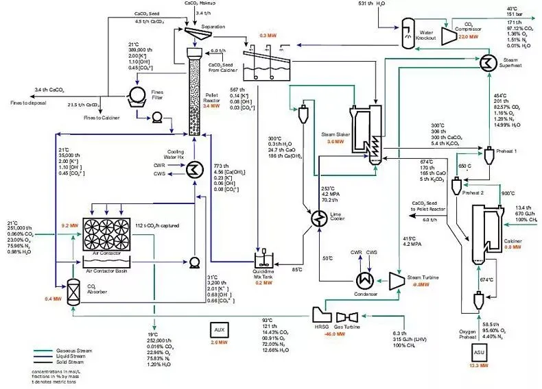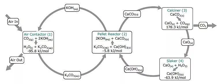 回收工艺并不复杂,用初中学过的化学方程式就能表示。第一步循环利用KOH吸收空气中的CO2,生成K2CO3,然后再和Ca(OH)2反应,生成CaCO3和KOH;第二步循环将CaCO3高温分解,生成CaO和CO2,CaO和水反应继续生成Ca(OH)2。其中KOH和Ca(OH)2都可以循环使用。研究者对这两个循环过程进行了设备的配置和能量核算,在满负荷下,该装置每年可以从大气中收集约100万吨二氧化碳,相当于25万辆普通汽车每年的排放量。