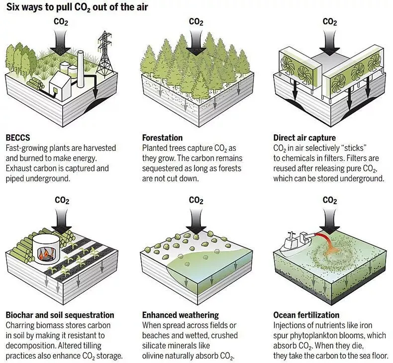 减少大气CO2的几种方法。图片来源自网络