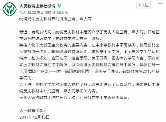 英雄人物作为爱国主义教育的重要内容,在中小学教材中不可缺失,编写教材必须秉持这一原则。国家统编教材编写组力求根据不同学段、不同年龄学生的认知特点,整体规划,合理布局,恰当呈现。关于卫青、霍去病的学习内容,原有版本历史教材安排在初中阶段,这次统编历史新教材安排在高中阶段,具体在高一上册“西汉与东汉——大一统国家的巩固”一课中专门讲授。新教材将在2018年秋季使用。