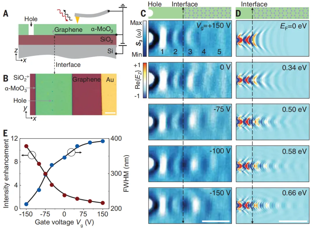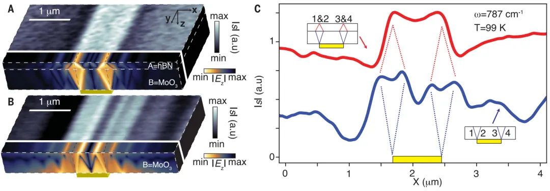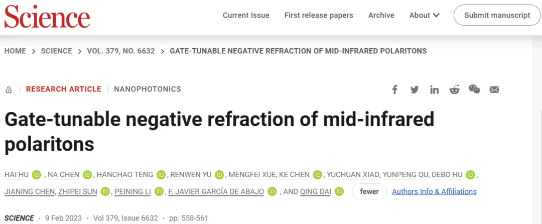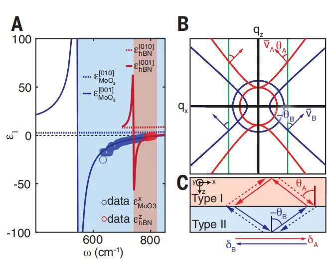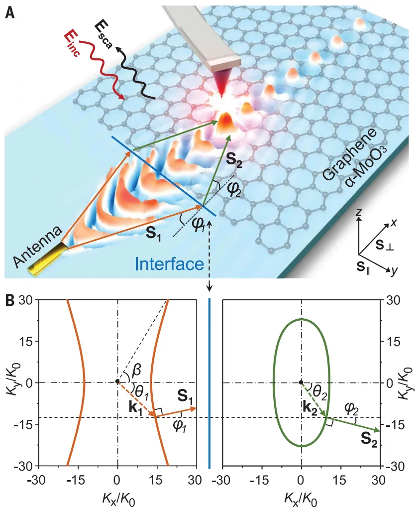 折射作为一种常见的效应,其代表着光束在从一种介质传播到另一种介质时会改变方向的现象。负折射是一种非直观但公认的效应,其中光束在“错误”方向上弯曲。在本期的Science中,来自中国国家纳米科学中心的团队,以及美国哥伦比亚大学的团队独立地证明了二维范德华材料界面处的负折射现象。国家纳米科学中心戴庆研究员和胡海副研究员等人使用带有石墨烯覆盖层的α-MoO3来显示中红外(mid-IR)极化子的面内负折射发生在界面处,并且是栅可调的。美国哥伦比亚大学A. J. Sternbach教授等人使用MoO3/h11BN双晶来表明中红外极化子的负折射发生在界面垂直传播时。中红外中的极化负折射为光学和热应用提供了机会,例如红外超分辨率成像、纳米级热操纵和具有增强灵敏度的化学传感器件。负折射在光学、纳米电子学、声学和磁性中被广泛研究,作为一种违反直觉的物理现象,在亚波长成像和隐身等方面具有强大的应用潜力。在过去的二十年中,该领域取得了实质性进展,通常使用金属超材料,介电光子晶体和双曲超材料,由亚波长晶胞的周期性阵列组成,在这些结构中调用的超材料限制了它们强烈限制光的能力。作为替代方案,金属等离激元在紫外线,可见光和近红外区域也表现出负折射,但这种方法受到可见光和较高频率下的欧姆损耗,以及红外范围内空间限制差的限制。因此,尽管具有采样和控制分子振动和热辐射的潜力,但中红外和太赫兹域的深亚波长负折射仍然是一个挑战。随着范德华(vdW)材料的出现,其能够通过利用其极化子模式的强光学限制,在宽光谱范围内控制纳米尺度的光引入了新的自由度。最近的理论研究提出了使用vdW极化子来实现深亚波长中红外负折射,例如,在石墨烯的周期阵列中,或使用平面石墨烯和六方氮化硼(h-BN)异质结构。然而,这些结构中极化子的极端空间限制阻碍了其分散的定制,这种结构固有的反射和散射损耗也使理论概念的实现更加复杂化。国家纳米科学中心戴庆研究员和胡海副研究员,西班牙巴塞罗那科学技术学院F. Javier García de Abajo教授等人证明了在范德华异质结构中使用混合拓扑极化子在中红外频率下的门可调谐负折射。